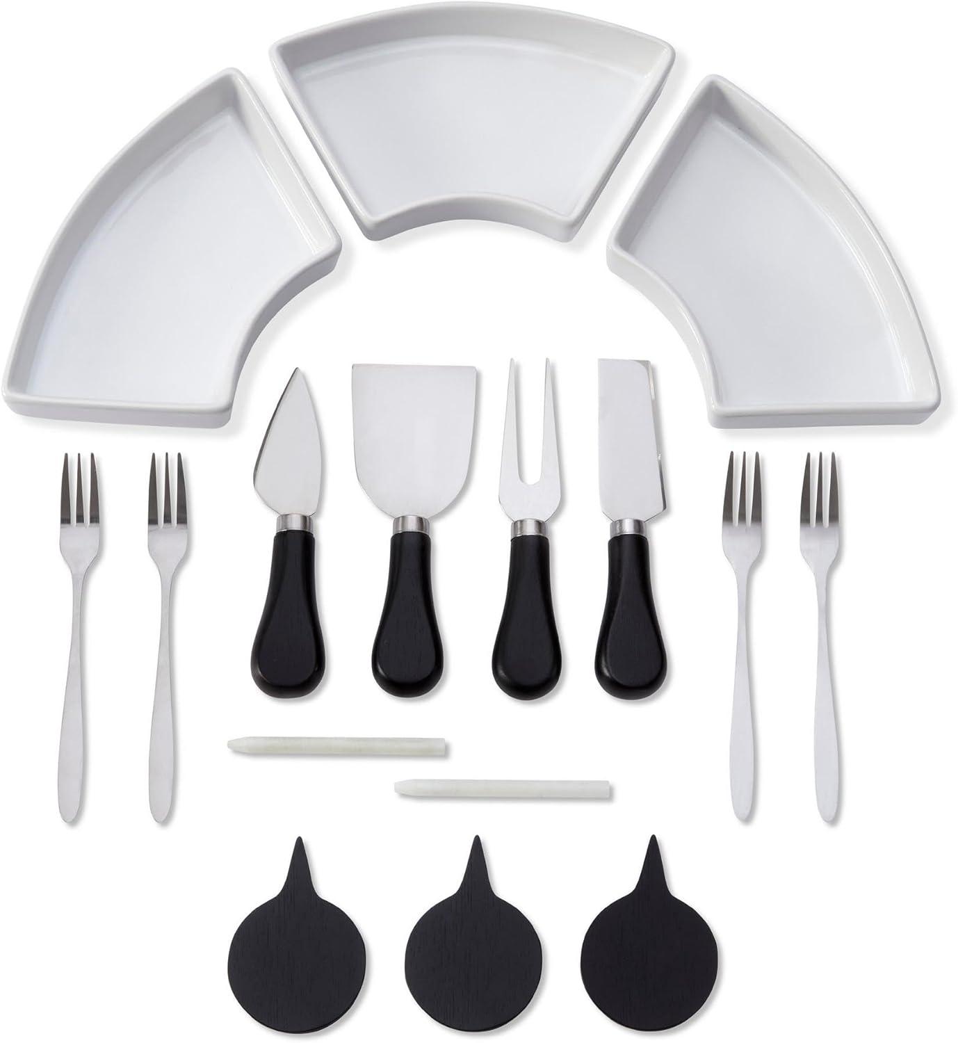 Rotating Swivel Top Design: Convenient rotating top swivels open to reveal an accessory compartment holding 4 cheese knives 4 forks 3 ceramic bowls and 3 chalkboard cheese markers for added convenience and style perfect for entertaining guests with ease