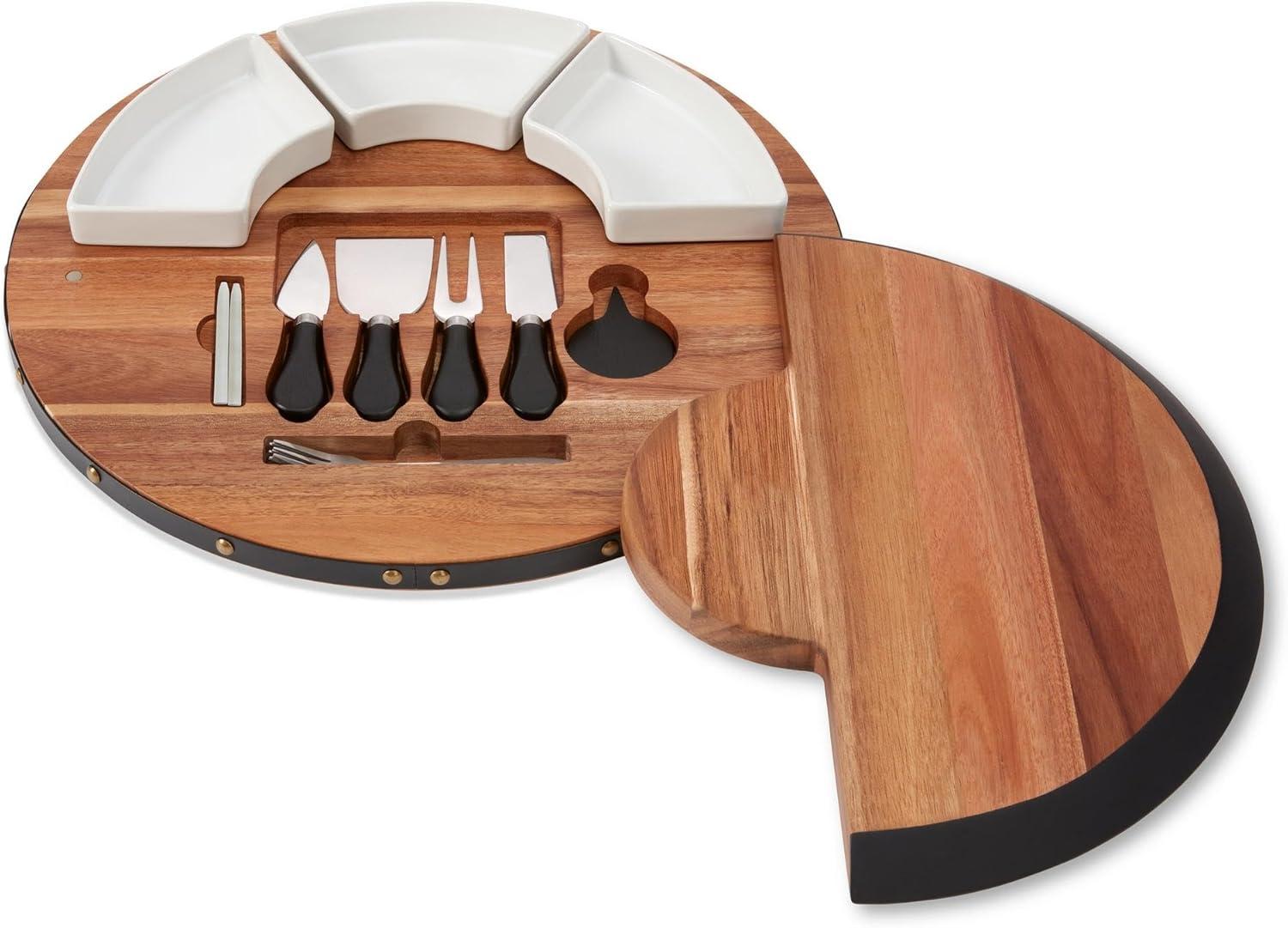Wine Enthusiast Barrel-Inspired Acacia Wood Swivel Cheese Board Set with Chalkboard Edge Includes 4 Cheese Knives, 4 Forks, 3 Cheese Markers, 3 Ceramic Bowls, Soapstone Chalk Charcuterie Entertaining