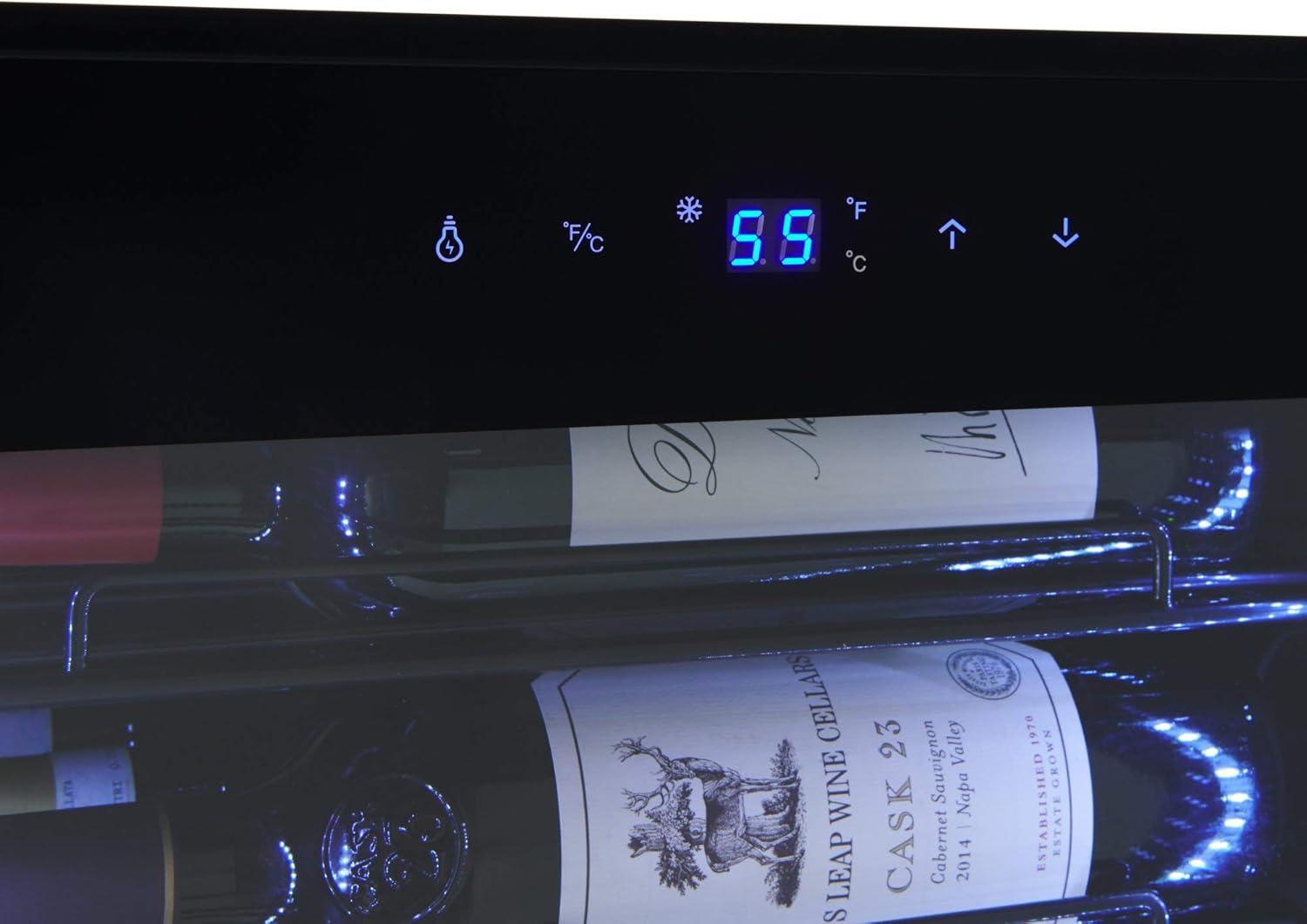 Elegant Design: With its black glass exterior door and black trim, the fridge has a sleek and modern aesthetic. The black cabinet further enhances its elegant appearance, making it a stylish addition to any home, kitchen, or wine cellar. And the LED display lighting adds a touch of sophistication