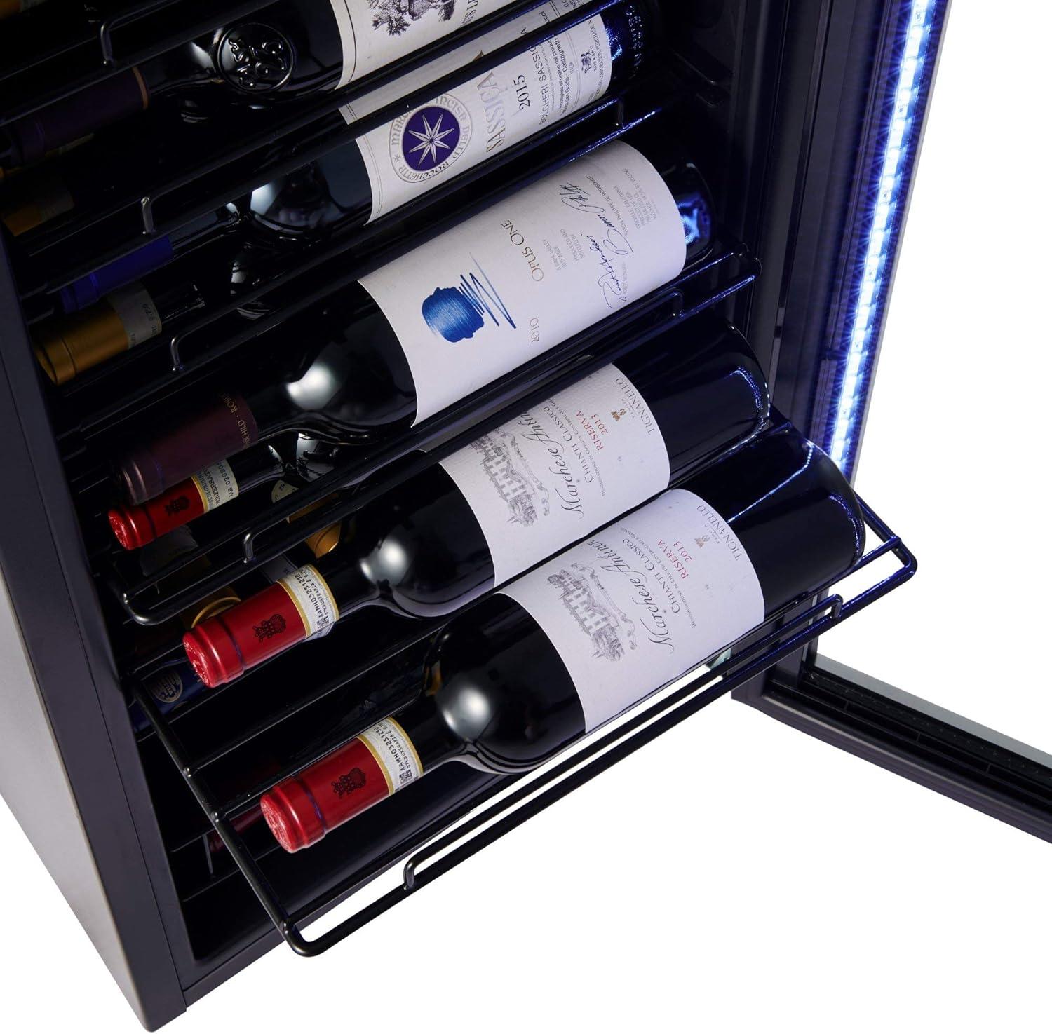 Sleek Showcasing: The wine fridge features a matrix shelf design that optimizes space and allows for efficient organization of your wine collection. Each bottle is securely cradled, preventing movement and ensuring that your wines remain undisturbed and well-preserved