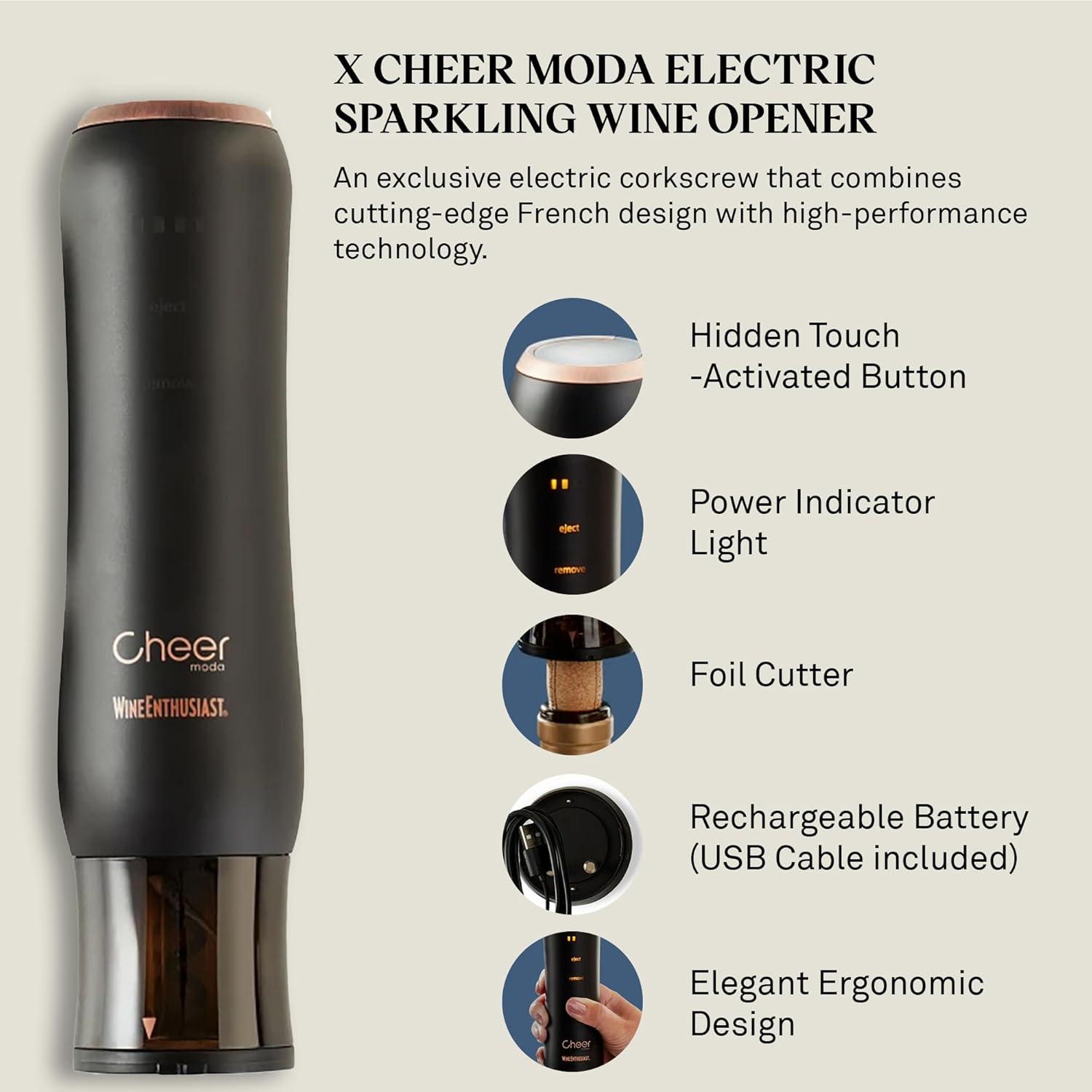 Wine Enthusiast x Cheer Moda Electric Sparkling Wine Opener – Automatic Champagne Bottle Opener with Cork Release & Stopper – Stainless Steel Electric Wine Tool – Battery Powered – U.S. Exclusive(Sparkling Wine)